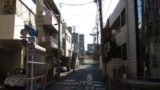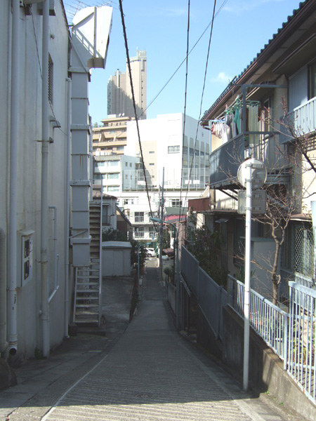 勾配具合がゆるくなる坂下あたりから、坂上のほうを見てみたものですが、なんとなく露地と坂がうまい具合にまざっていて、その奥には円通寺坂 (NO.134) があり(しかも日があたっていてわかりやすいのですが、斜めになって合流していますね)、そのさらに奥の大きなビルがさらにこの坂道のスケールの小ささを強調しているみたいで、坂上からみるよりなんだか印象的だったかもです。