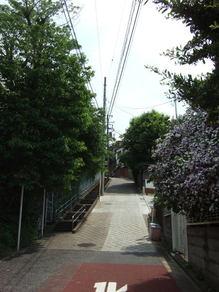 左側は広大な校庭を持つ専門学校があって樹々が道までせり出してきていて、それだけでもいい感じなのですが、坂道自体に目をむけても勾配具合やスロープと階段の合わせ技といい名前のない坂にしておくのはもったいないくらいの坂道でした。