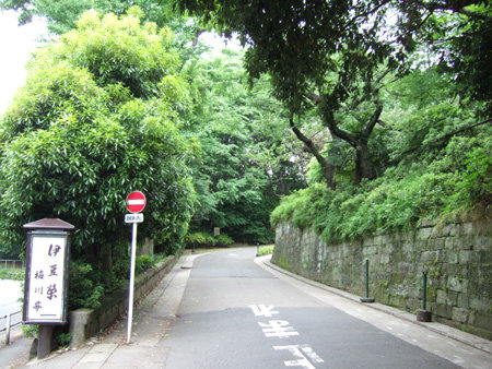 「とある街の風景(上野東照宮の男坂?)」の坂上のほうで登場した伊豆栄梅川亭へ車で行き来できる道でもあるみたいで、写真のようななかなかしぶい看板が設置してありました。